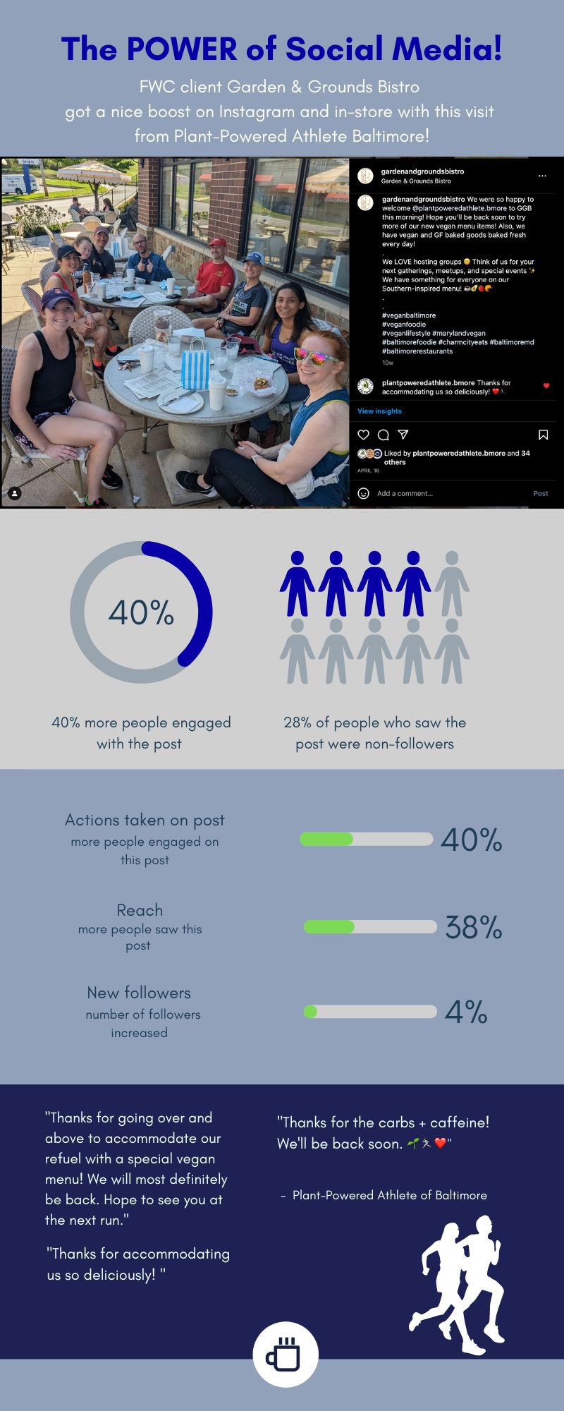 One of our clients, Garden & Grounds Bistro, got a nice boost on Instagram and in-store with a visit from Plant-Powered Athlete Baltimore. Our team grew this relationship over time through comments on their posts and in DMs. We saw from their posts that their local vegan running group met regularly at local coffee shops after their Sunday morning runs. We invited them to meet at Garden & Grounds to try their plant-based menu options, and they’ve already brought their group back twice to date! They promoted their post-run meetups on their own IG, and we posted about each of their visits on the Garden & Grounds IG account. Meanwhile, we’ve developed a lovely partnership with a local group and we look forward to their next visit!