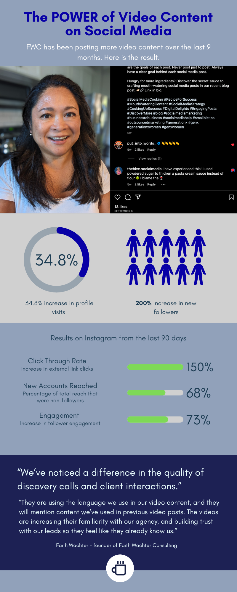 Since we began using video strategically, “we’ve noticed a difference in the quality of discovery calls and client interactions. They are using the language we use in our video content, and they will mention content we’ve used in previous video posts. The videos are increasing their familiarity with our agency, and building trust with our leads so they feel like they already know us.” (Faith Wachter, FWC agency founder)