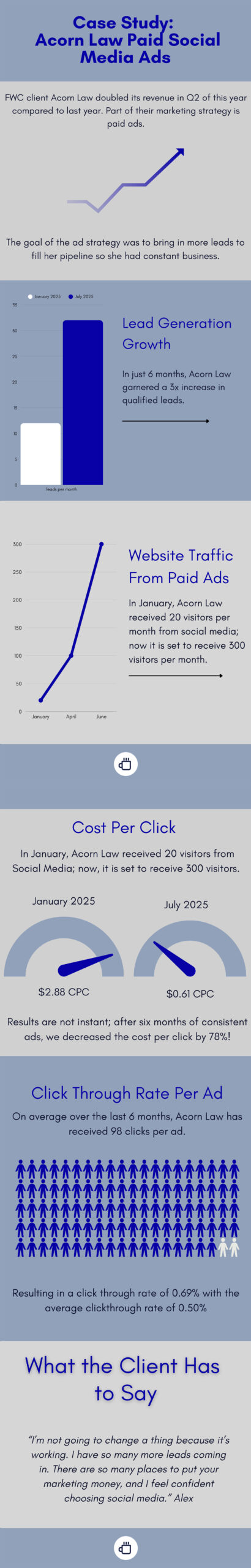 Social media ads are used across industries to drive serious revenue. If you haven’t found success with them yet, chances are you need an expert to clarify your strategy. By outsourcing your social media ad strategy, you could see results like Acorn Law. Doubling your quarterly revenue and building a steady stream of clients for your service-based business.
